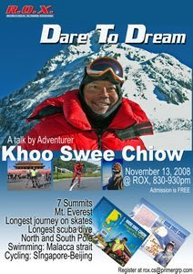 Read moreSingaporean adventurer, author and inspirational speaker Khoo Swee Chiow will give a talk at ROX on November 13, 2008 830-930pm.